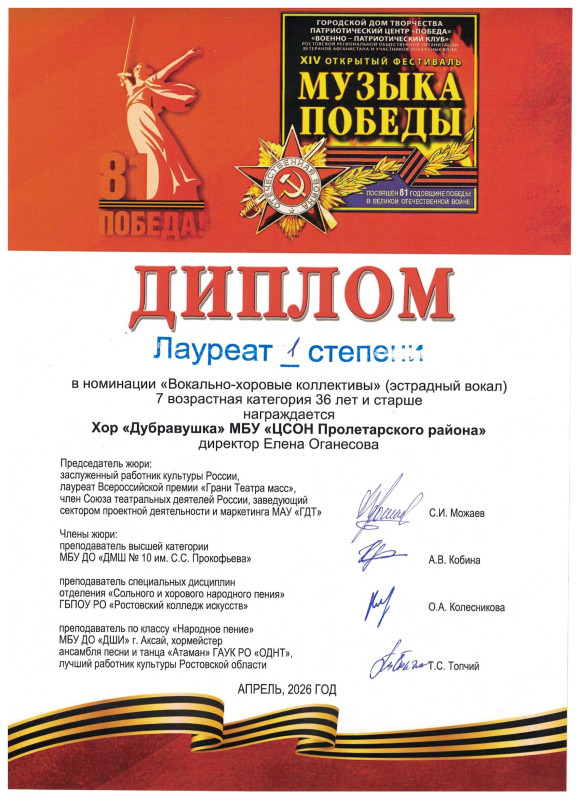 Диплом лауреата 1 степени, хор "Дубравушка"