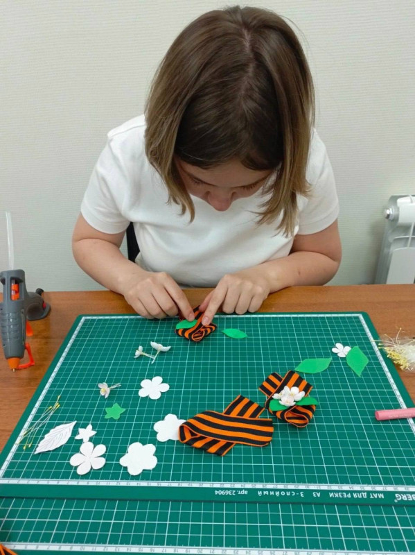 В центре социального обслуживания населения Пролетарского района города Ростова-на-Дону получатели социальных услуг дневного пребывания изготовили броши из Георгиевских ленточек