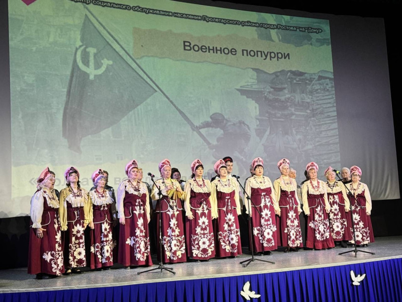 Участниками концерта стали получатели социальных услуг центра социального обслуживания населения Пролетарского района. Казачий хор «Дубравушка» подарил слушателям проникновенное военное попурри, которое заставило вспомнить о героических страницах нашей истории. А участники социокультурного проекта «Театр на ладони» показали спектакль по мотивам радиопостановки Маргариты Микаэлян «Русские женщины», наполненный глубоким смыслом и патриотизмом.