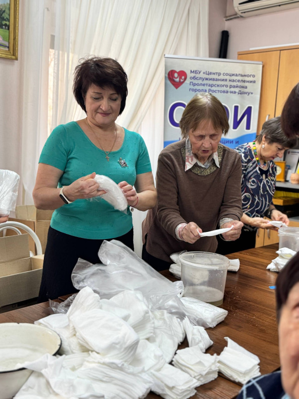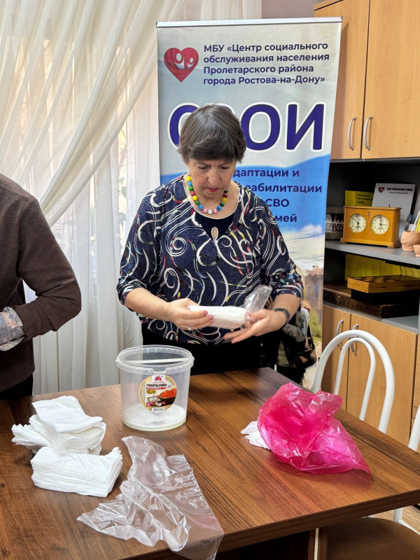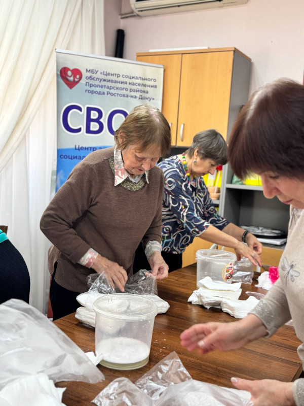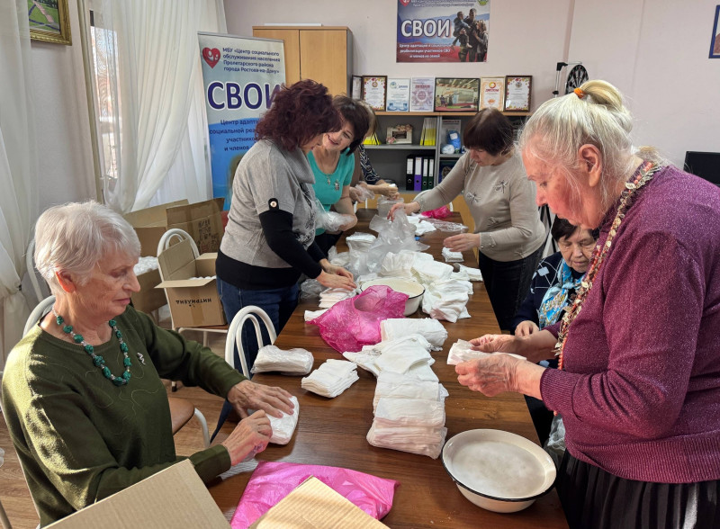 В Центре адаптации и социальной реабилитации участников СВО и членов их семей «СВОИ» в рамках региональной программы «Активное долголетие» и городского проекта «Время активных» получатели социальных услуг Центра социального обслуживания населения Пролетарского района города Ростова-на-Дону продолжают важную и нужную работу — сбор и упаковка влажных салфеток для фронта и раненых бойцов!