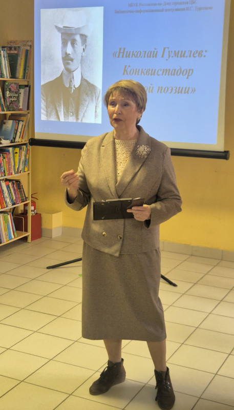 В Центре социального обслуживания населения Пролетарского района города Ростова-на-Дону в партнёрских отношениях с БИЦ им. И.С. Тургенева успешно реализуется работа факультета «Живое слово». 14 апреля «серебряные» получатели социальных услуг совершили погружение в эпоху поэзии Серебряного века на литературной встрече «Конквистадор русской поэзии», посвящённой творчеству поэта Николая Гумилёва.