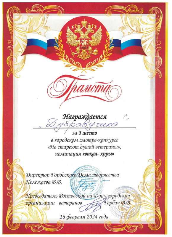 Достойное выступление, слаженность голосов и правильно подобранный репертуар не оставили жюри равнодушными! Хор «Дубравушка» Центра социального обслуживания населения Пролетарского района города Ростова-на-Дону стал победителями городского смотра-конкурса художественной самодеятельности «Не стареют душой ветераны» в номинации «Вокал-хоры».